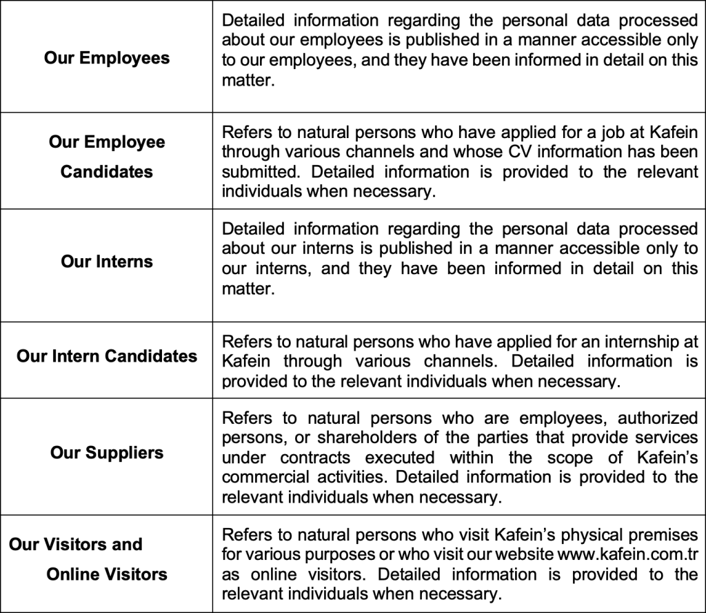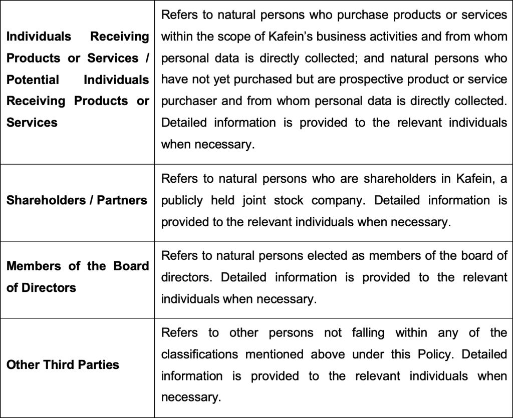 This Policy applies to all personal data belonging to, but not limited to, our employees, employee candidates, interns, intern candidates, supplier representatives, supplier employees, visitors, shareholders and partners, members of the board of directors, online visitors, individuals who receive products or services and potential product or service recipients, and other third parties, which are subject to data processing activities by Kafein.