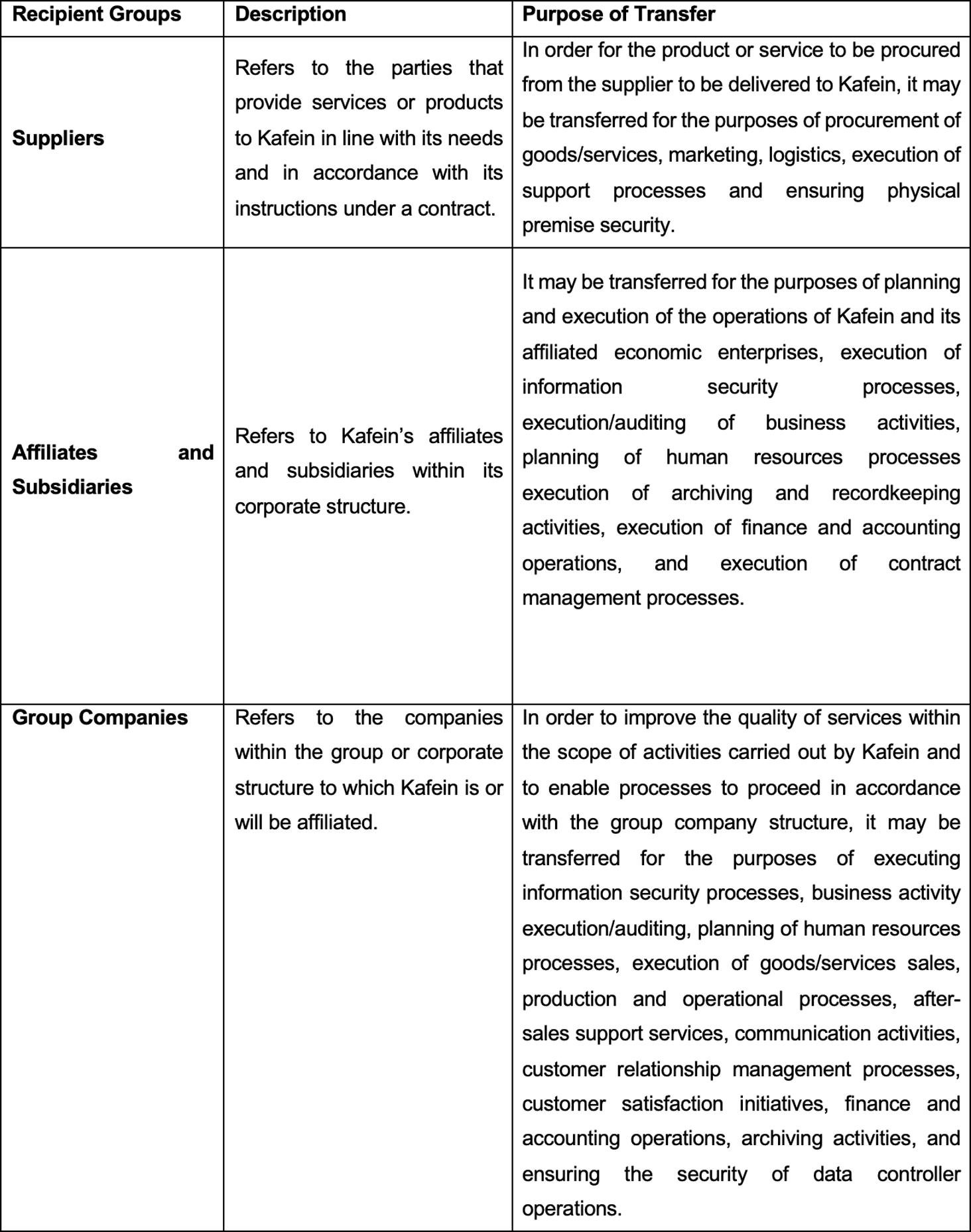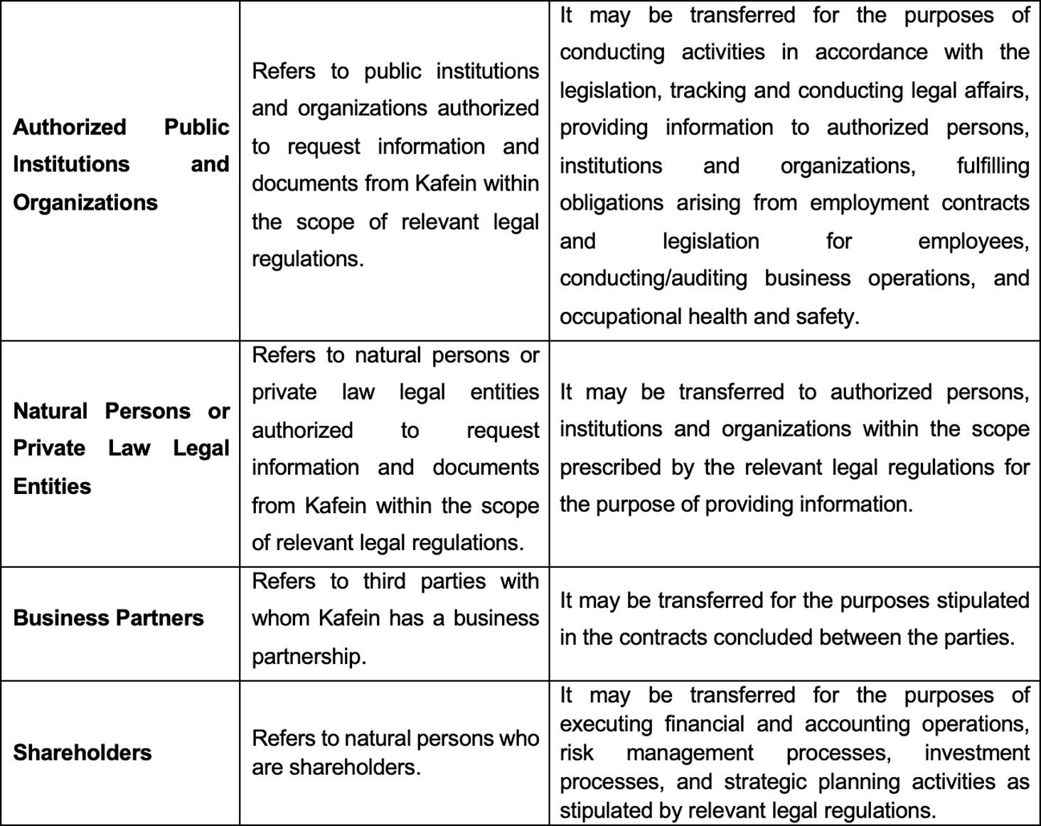 As Kafein, our purposes for processing personal data are detailed in the Disclosure Texts prepared for each data category and data subject category.