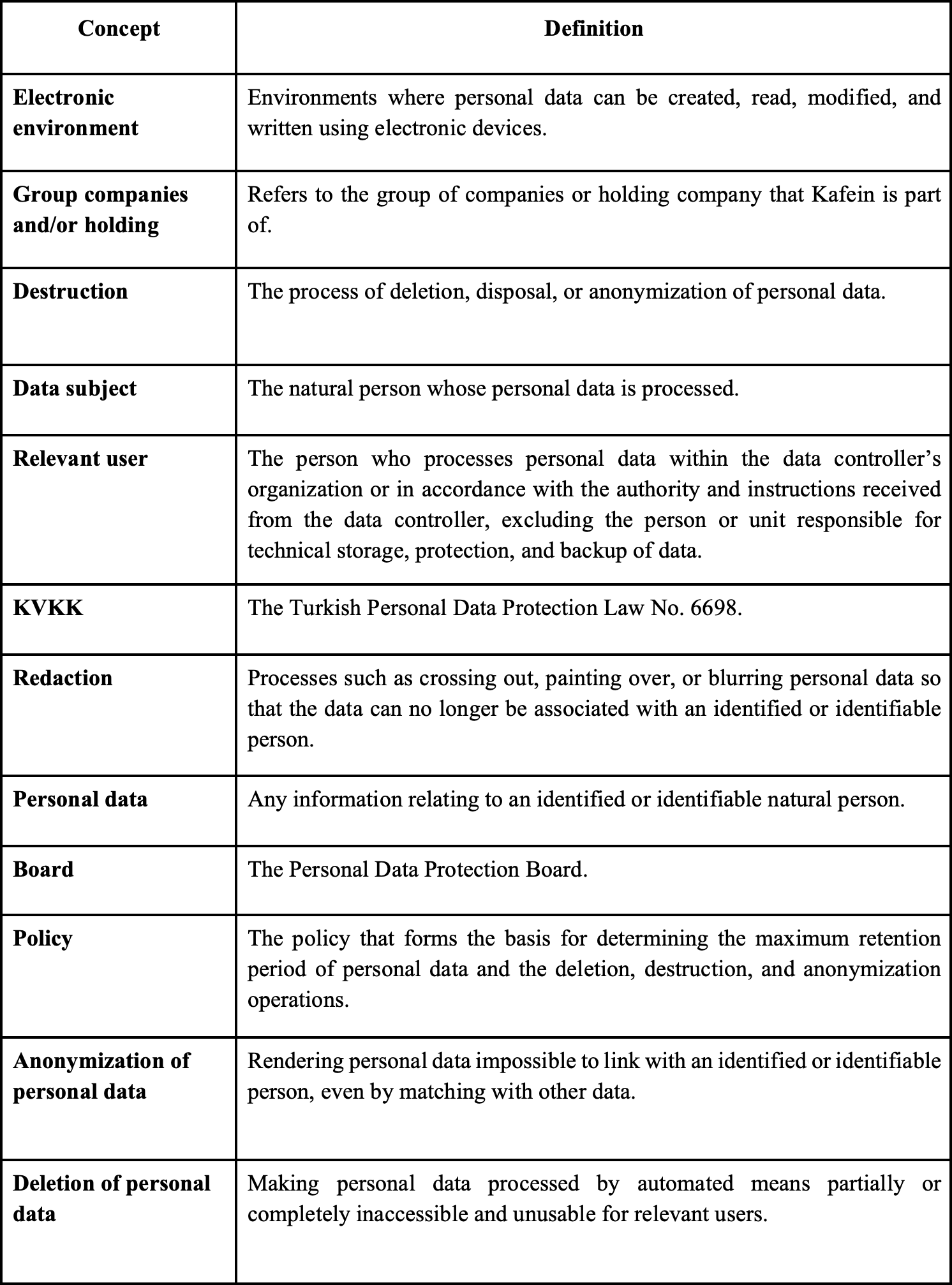 Kafein Yazılım Hizmetleri Ticaret A.Ş. (“Kafein” or the “Company”) pays utmost attention to the retention and destruction of personal data in compliance with the Constitution of the Republic of Turkey, the Law on the Protection of Personal Data No. 6698 (“KVKK”), the Regulation on the Deletion, Destruction or Anonymization of Personal Data published in the Official Gazette dated 28.10.2017 and numbered 30224 (“Regulation”), and other applicable legislation, regarding the personal data of real persons including employees, employee candidates, interns, intern candidates, visitors, supplier representatives, supplier employees, individuals who receive products or services, potential product or service recipients, shareholders/partners, members of the board of directors, and other third parties.