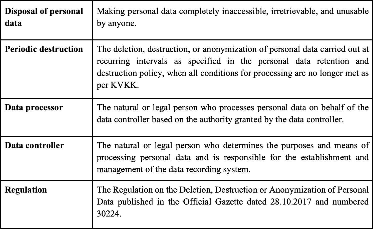 The Policy pertains to the retention and destruction of these personal data processed by the Company in any electronic or physical environment and has been prepared in consideration of the KVKK, all primary and secondary applicable legal regulations, as well as relevant international standards and guiding documents in this field.