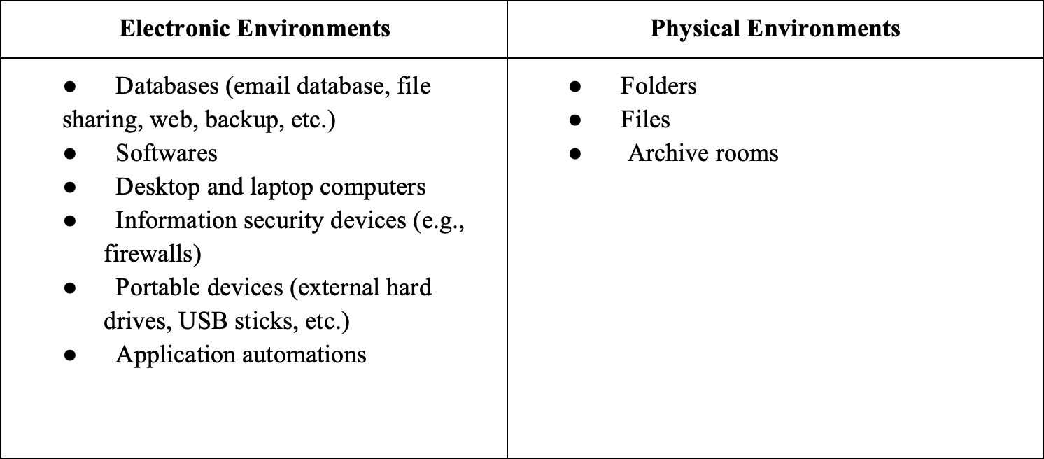- Corporate policies are implemented regarding access, information security, usage, storage, and destruction,