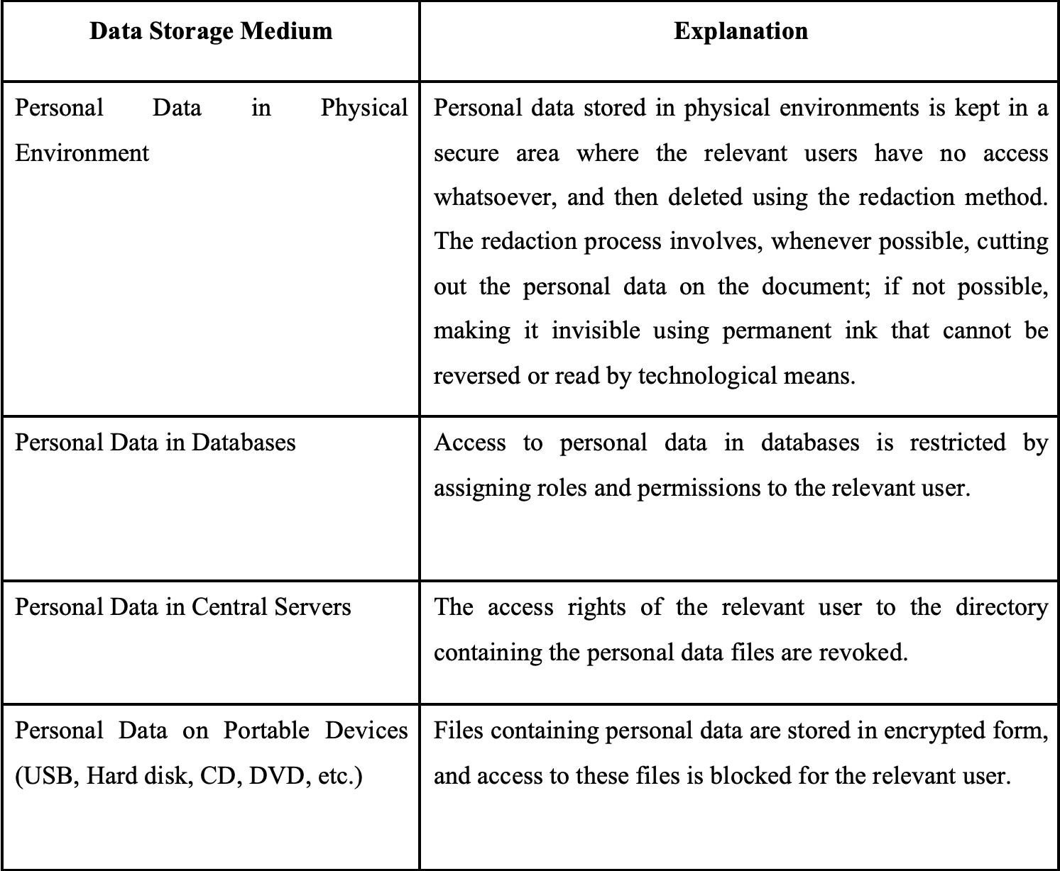 - Security of physical areas containing personal data against external risks (fire, flood, etc.) is ensured,